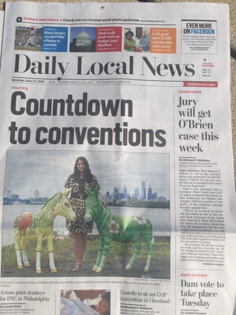 Artist Lynnette Shelley was of the 28 artists selected to participate in this project. She painted the donkeys for Missouri and Oklahoma in a warehouse in Port Richmond along with the other artists over week period in mid June 2016. Some photos of the donkeys are below. You can click here to read Lynnette's blog and photoset documenting the donkey painting process.